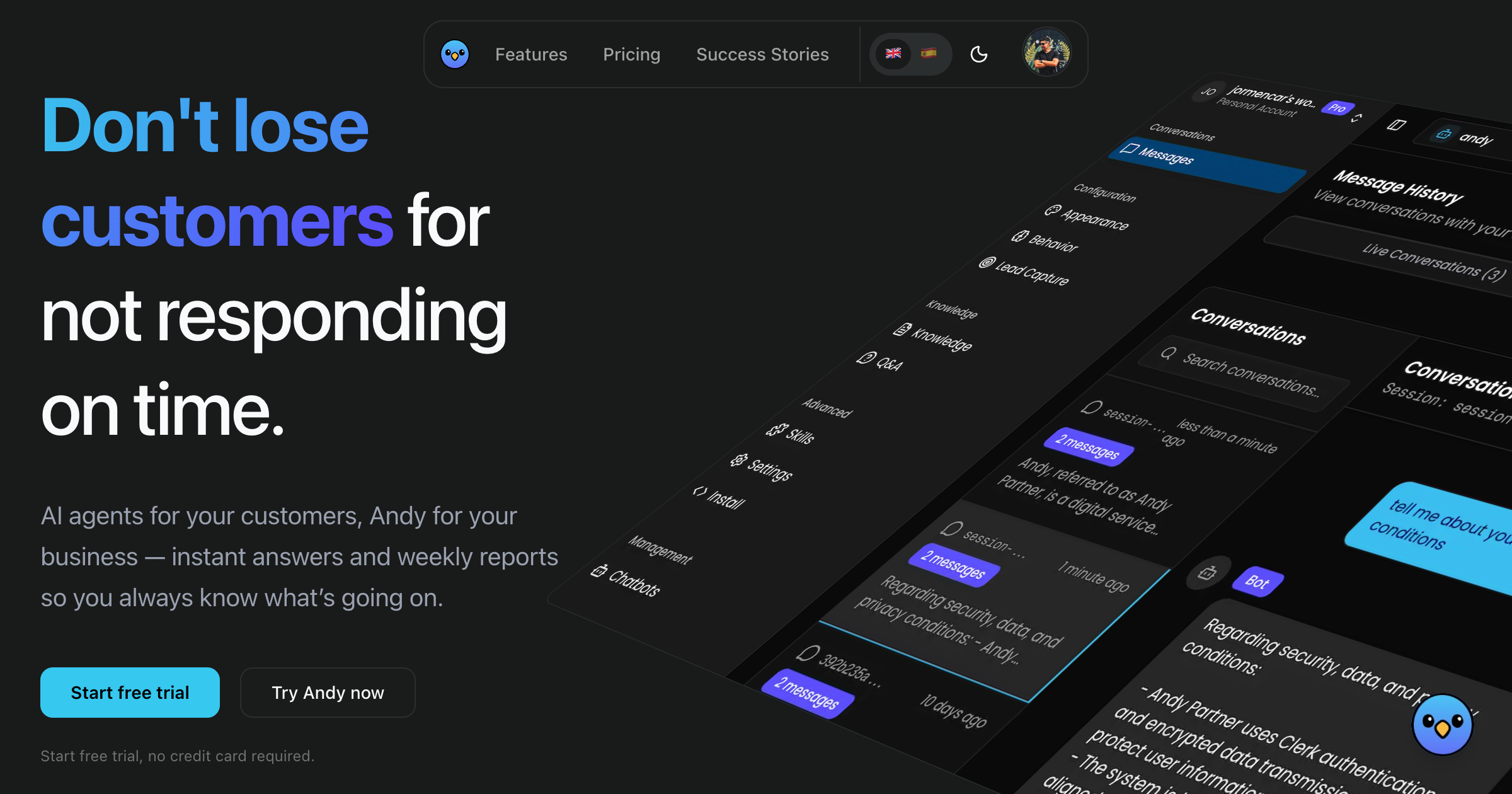 AI agents for your customers, Andy for your business — instant answers and weekly reports so you always know what’s going on.